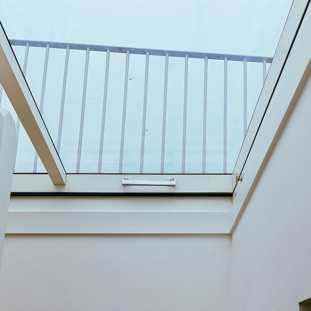 The client wanted access to a roof terrace via a sliding rooflight, the site was very tight with no possibility of using a crane, we provided genuine first, a ‘manual’ sliding rooflight, normally sliding rooflights are electric.